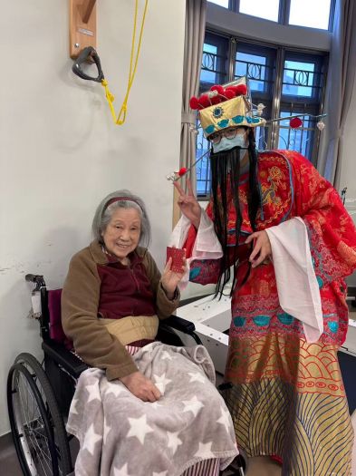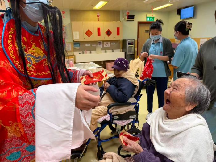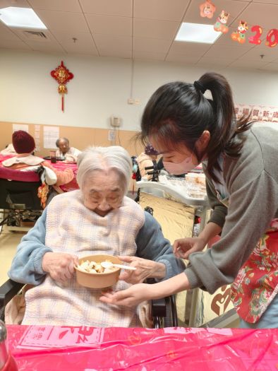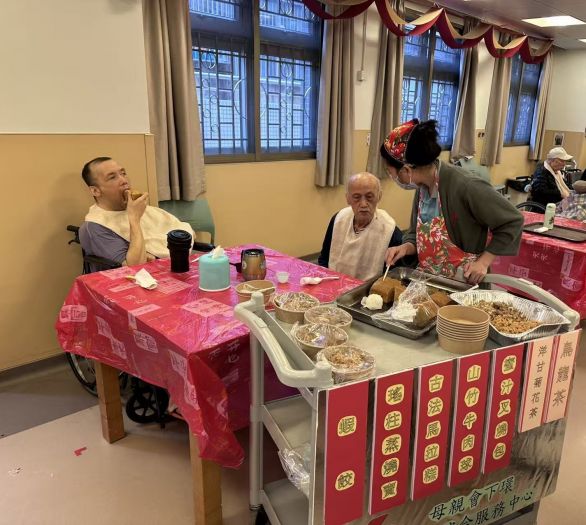 活動當日,職員首先化身「財神」向院友大派利是,送上新春祝福,逗得長者笑逐顏開,喜氣洋洋。緊接著,職員再度變身成為「點心姐姐」,推著懷舊點心車穿梭於餐桌之間,親切地詢問長者「飲咩茶?」、「食咩點心?」,讓院友可按個人喜好選擇茶類,以及蝦餃、燒賣等經典「一盅兩件」。在茶樓點心香氣中,現場歡笑聲不斷,長者臉上洋溢著滿足的神情。